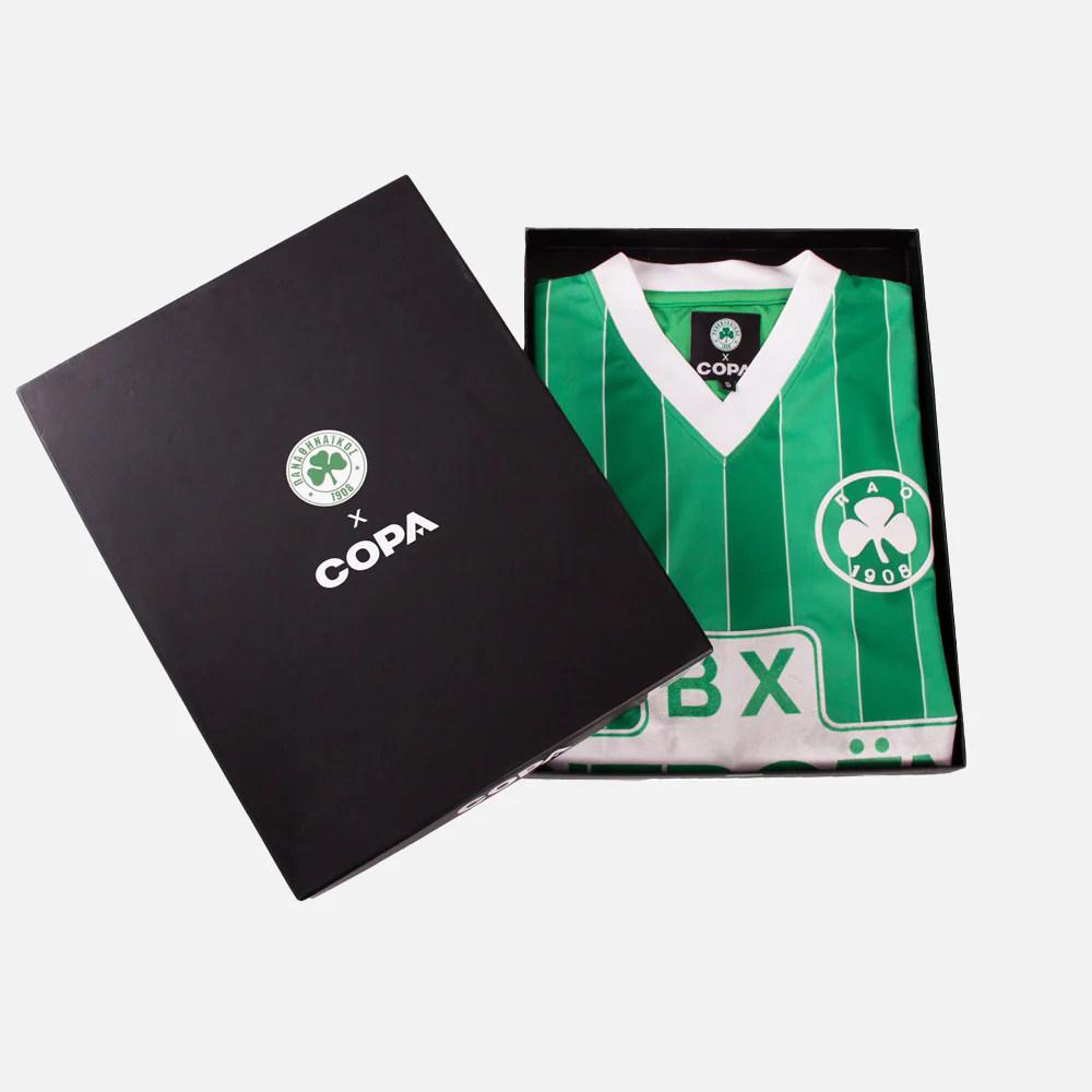 Και τι παρελθόν… Η φανέλα της σεζόν 1984-85 είναι αυτή που φορούσαν οι Σαραβάκος, Ζάετς, Δημόπουλος και σία όταν ο ΠΑΟ όταν έφτασε στα ημιτελικά του Champions League (τότε Κύπελλο Πρωταθλητριών)